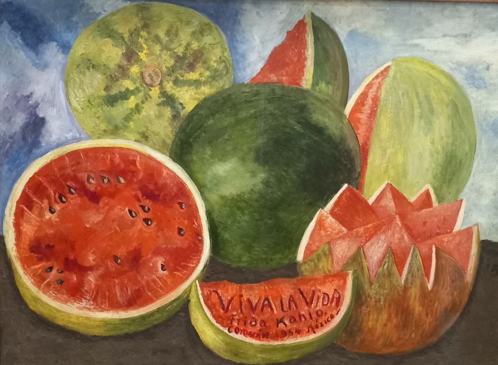 Frida Kahlo wrote the words “Viva la vida” – or “Long live life” – on this sumptuous painting that she completed just a few days before she died in 1954. With all the hype and commercialism that has come to immerse her in recent years, it was a real treat to be able to visit her actual home in Mexico City, where she grew up and where she died, and walk through the blooming garden and the colorfully decorated rooms, with their pictures, among others, of Marx and Lenin on the walls, and get a feel for what inspired that remarkable woman.