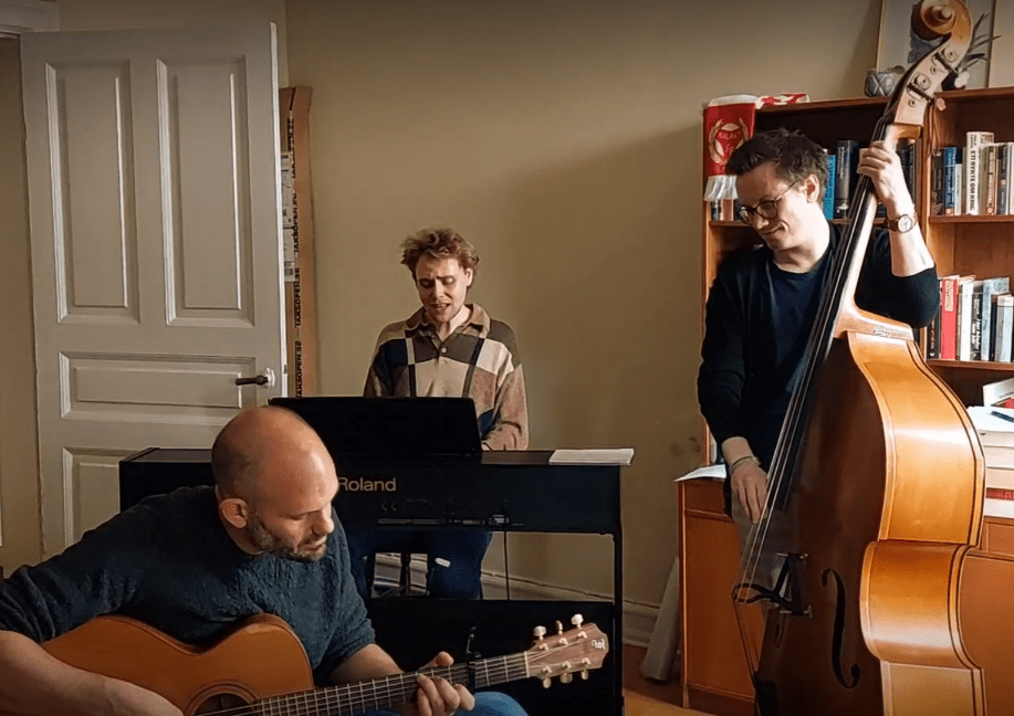 As he describes them, “Trä 2 1 is a new folk trio consisting of Axel Ahlin (vocals and piano), of Pierre Engström (guitar), and Olof Johansson (double bass). They perform songs with themes centered around nature and climate, but above all, they play music that they themselves find enjoyable and fun to perform.”